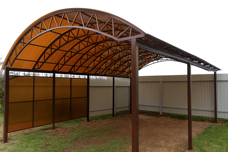Клиент может заказать навес для автомобиля из поликарбоната в типовом исполнении или в виде индивидуального проекта. Все конструкции адаптируются под компактных или больших участков, а также сочетаются с архитектурой дома. Возможность купить навес для автомобиля из поликарбоната недорого зависит от выбранной формы, толщины покрытия и длины пролета.