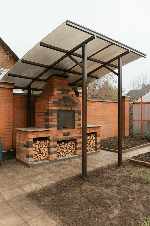 - Размер и форма: навес под мангальную зону изготавливается по индивидуальным размерам — цена зависит от площади и особенностей размещения.
